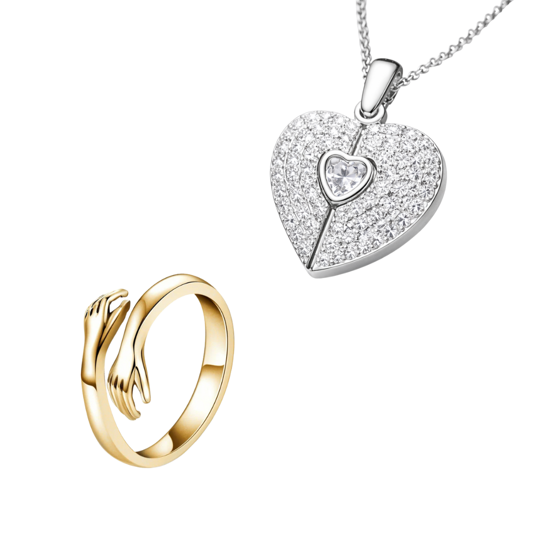 Price: $49.99 — Bundle includes both Hug Necklace and Hug Ring - Choose gold or silver for your perfect match. Velvet pouch with cloth & Message card